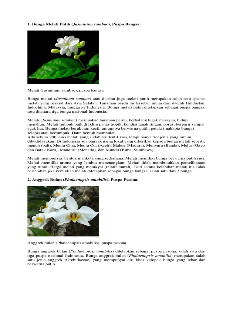 Penetapan ini terdapat pada Undang-Undang Tahun 1990. 23042010 Anggrek bulan Phalaenopsis amabilis merupakan salah satu bunga nasional Indonesia Anggrek bulan Phalaenopsis amabilis ditetapkan sebagai Puspa Pesona Indonesia mendampingi bunga melati Jasminum sambac yang ditetapkan sebagai puspa bangsa Indonesia dan padma raksasa Rafflesia arnoldii sebagai puspa langka Indonesia. Bunga melati Jasminum sambac atau disebut juga melati putih merupakan salah satu spesies melati yang berasal dari Asia Selatan.