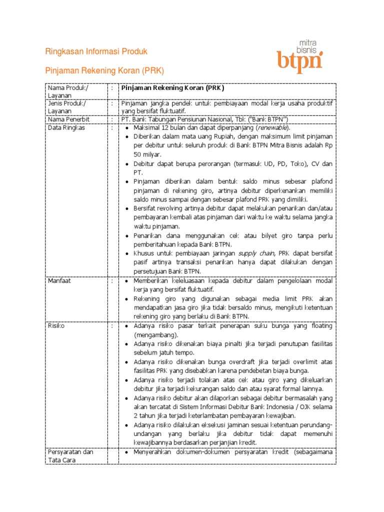 Debitur bisa membayar pokok bunganya saja dan pokok bunga yang dibayar adalah dari dana pinjaman yang digunakan. Kelebihan dari fasilitas pinjaman ini adalah bunga yang dikenakan hanya untuk berapa besar yang digunakan dari plafond kredit yang diberikan. Pinjaman Rekening Koran PRK Jenis Produk Layanan.