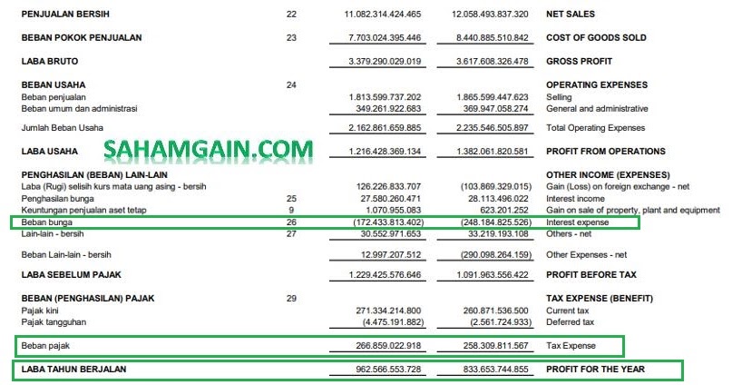 Cara mencari beban bunga pada laporan keuangan. Perhatikan yang saya beri tanda lingkaran hijau. Untuk mencari nilai laba bersih setelah pajak laba tahun berjalan pajak beban pajak penghasilan dan interest beban keuangan bunga anda bisa cari di laporan laba rugi. Memahami cara membaca Laporan Laba Rugi sudah tentu menjadi persyaratan utama bagi khususnya pemakai Laporan Keuangan agar mereka bisa lebih memahami kondisi perusahaan yang tergambar dari Laporan Keuangan yang dihasilkan.