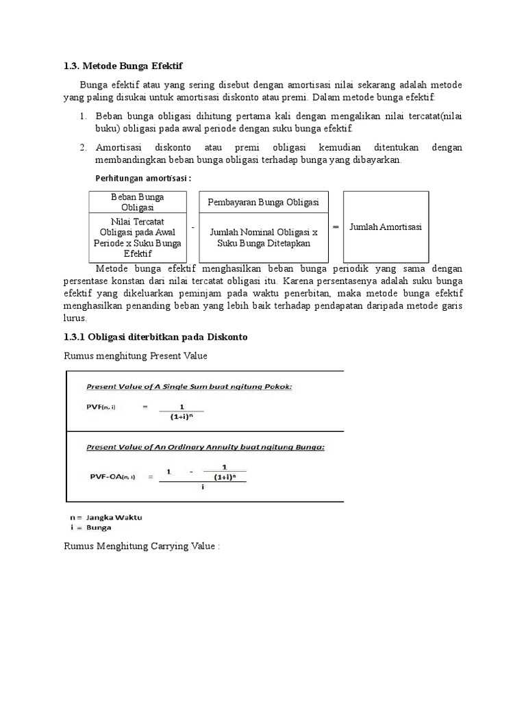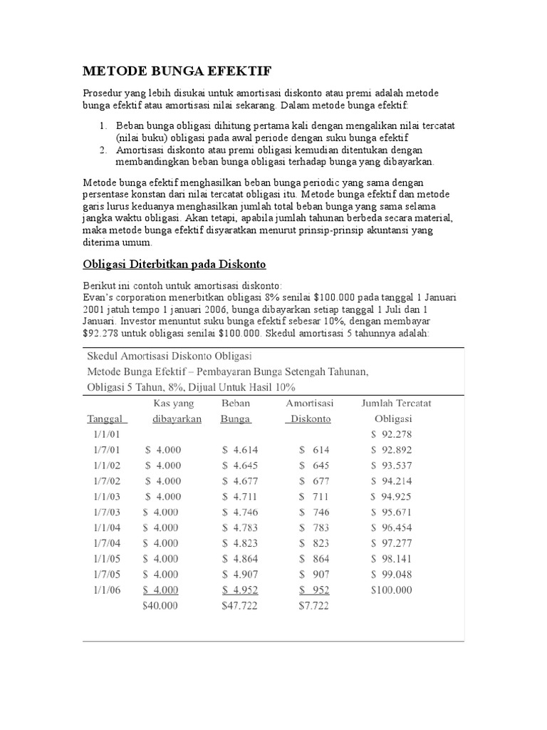 Sistem Bunga Efektif Sistem bunga efektif adalah porsi bunga dihitung berdasarkan pokok hutang tersisa. Jangka waktu obligasi 5 tahun dengan bunga 10 pertahun yang dibayarkan tiap tanggal 31 Desember. Pembeli membayar harga beli ditambah bunga berjalan yaitu bunga sejak tanggal pembayaran bunga terakhir sampai tanggal pembelian obligasi.