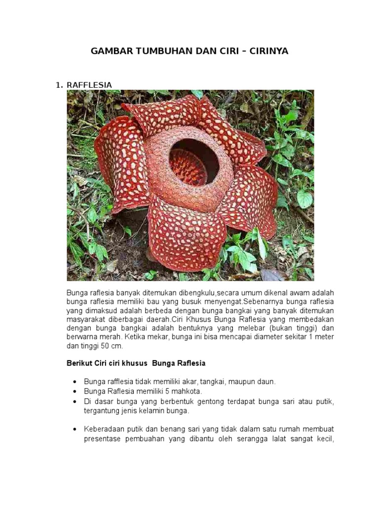 Ciri Khusus tanaman Raflesia Ciri Khusus Bunga Raflesia Tumbuhan ini banyak ditemui di hutan sumatera bagian selatan terutama Bengkulu Ciri Khusus Bunga Raflesia yang membedakan dengan bunga bangkai secara awam adalah bentuknya yang.