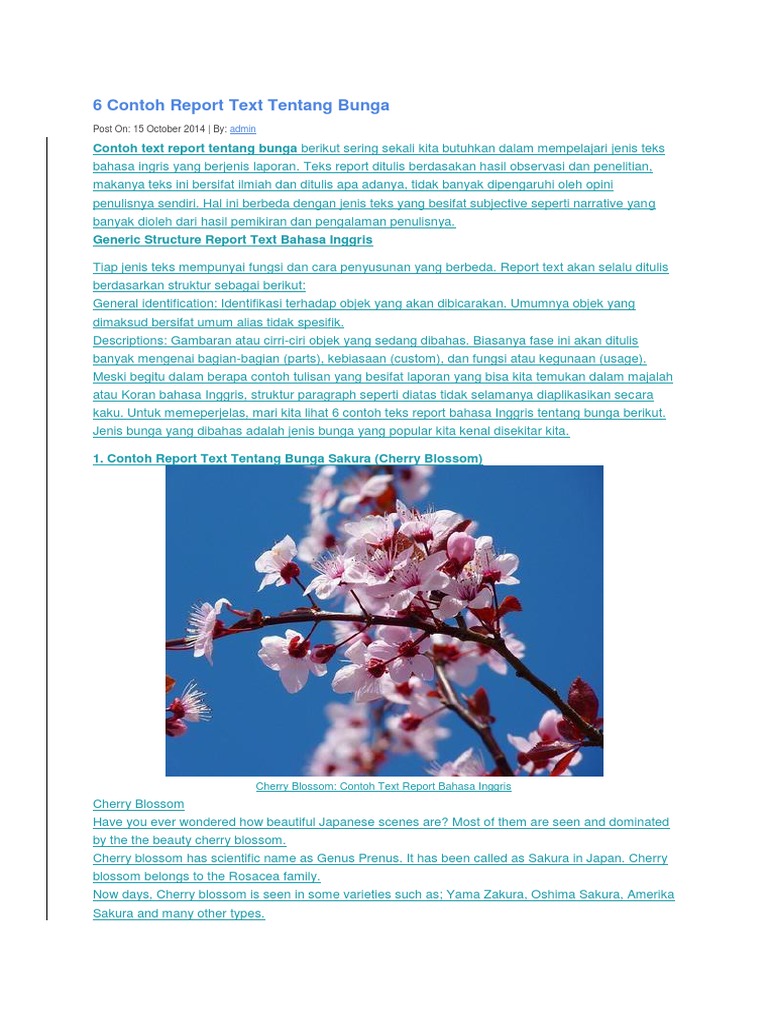 Untuk mengingatkan kembali The report text merupakan jenis teks yang digunakan untuk menjelaskan atau memaparkan sebuah informasi agar pembaca mengetahui secara umum sebuah kejadian alam atau hal yang alami. Cherry blossom belongs. Contoh report teks misalnya gambaran bunga mata hari secara umum gambaran gajah secara umum atau gambaran tentang kaktus secara umum.