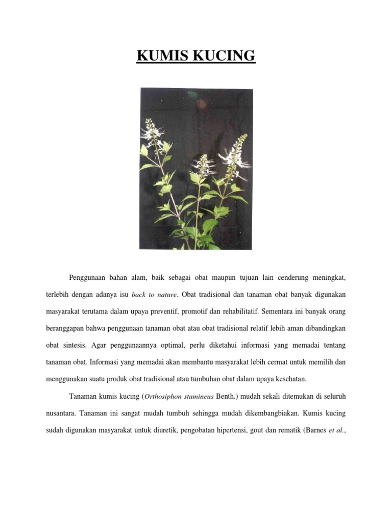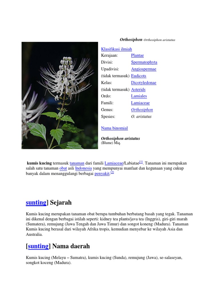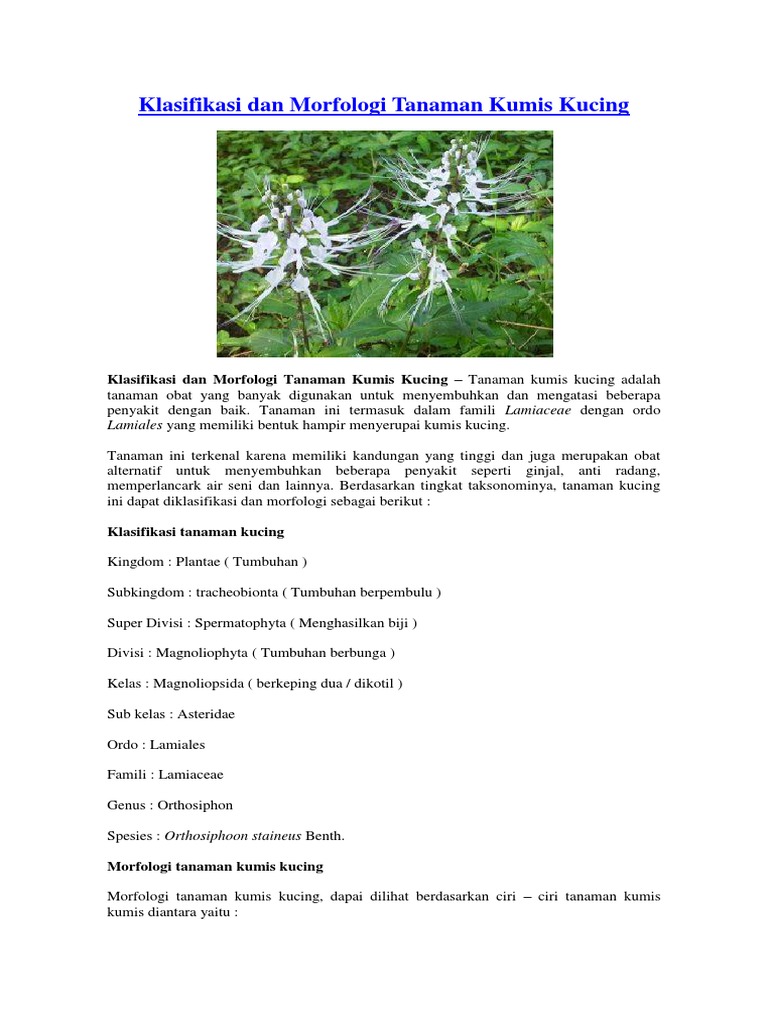 Klasifikasi bunga kumis kucing. Ekstrak daun kumis kucing juga dapat meningkatkan produksi empedu dan eliminasi asam empedu dari kandung empedu pada sukarelawan. Di Jawa kumis kucing dipercaya dapat secara efektif menghilangkan batu ginjal hingga ukuran 5 cm. Buah geluk berwarna coklat gelap panjang 175 2mm.