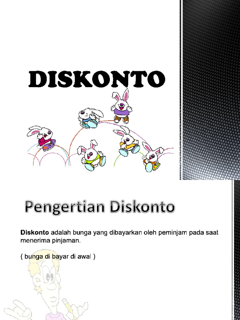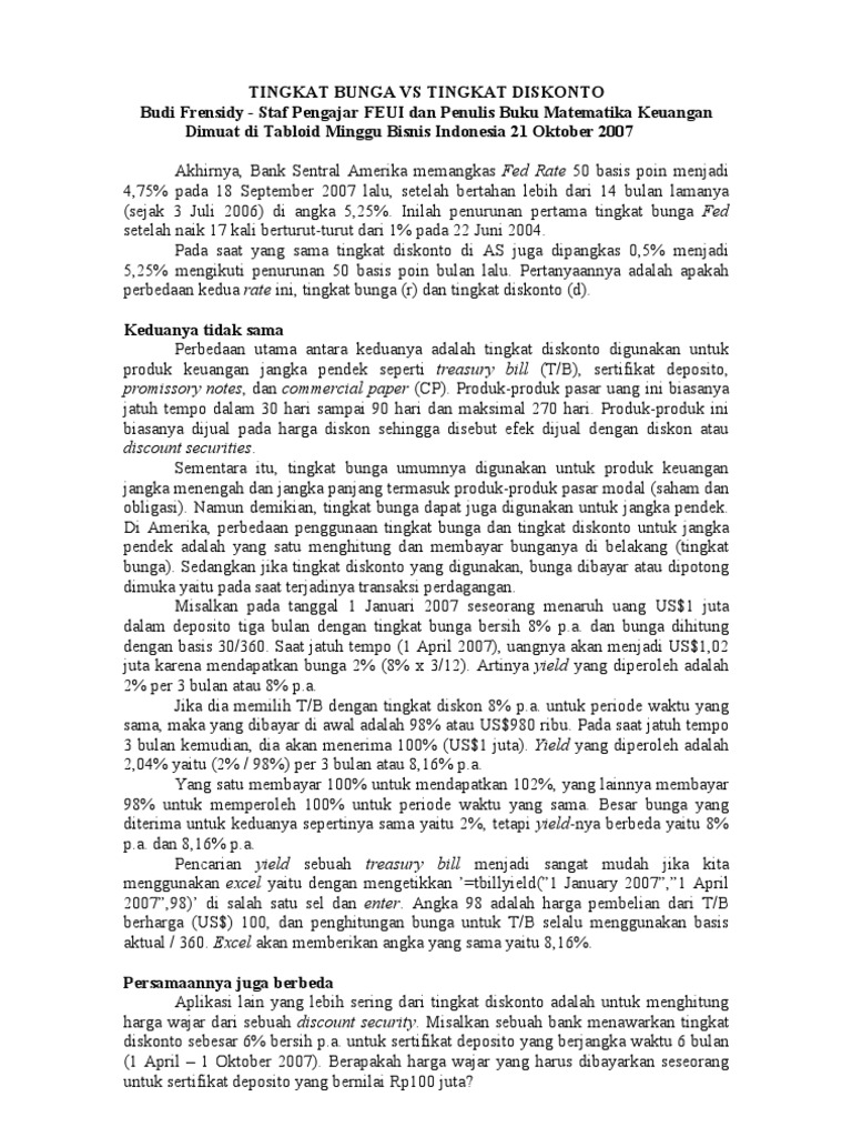 Pengenaan Pajak Penghasilan atas bunga dari deposito dan tabungan serta diskonto Sertifikat Bank lndonesia adalah sebagai berikut. Suku bunga dan tingkat diskonto adalah suku bunga yang berlaku bagi peminjam dan penabung yang membayar atau menerima bunga atas tabungan atau pinjaman. Keduanya tidak sama Perbedaan utama antara keduanya adalah tingkat diskonto digunakan untuk produk keuangan jangka pendek seperti treasury bill TB sertifikat deposito promissory notes dan commercial paper CP.