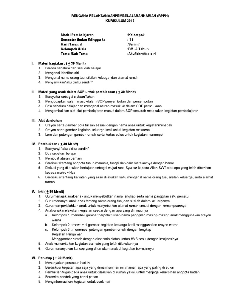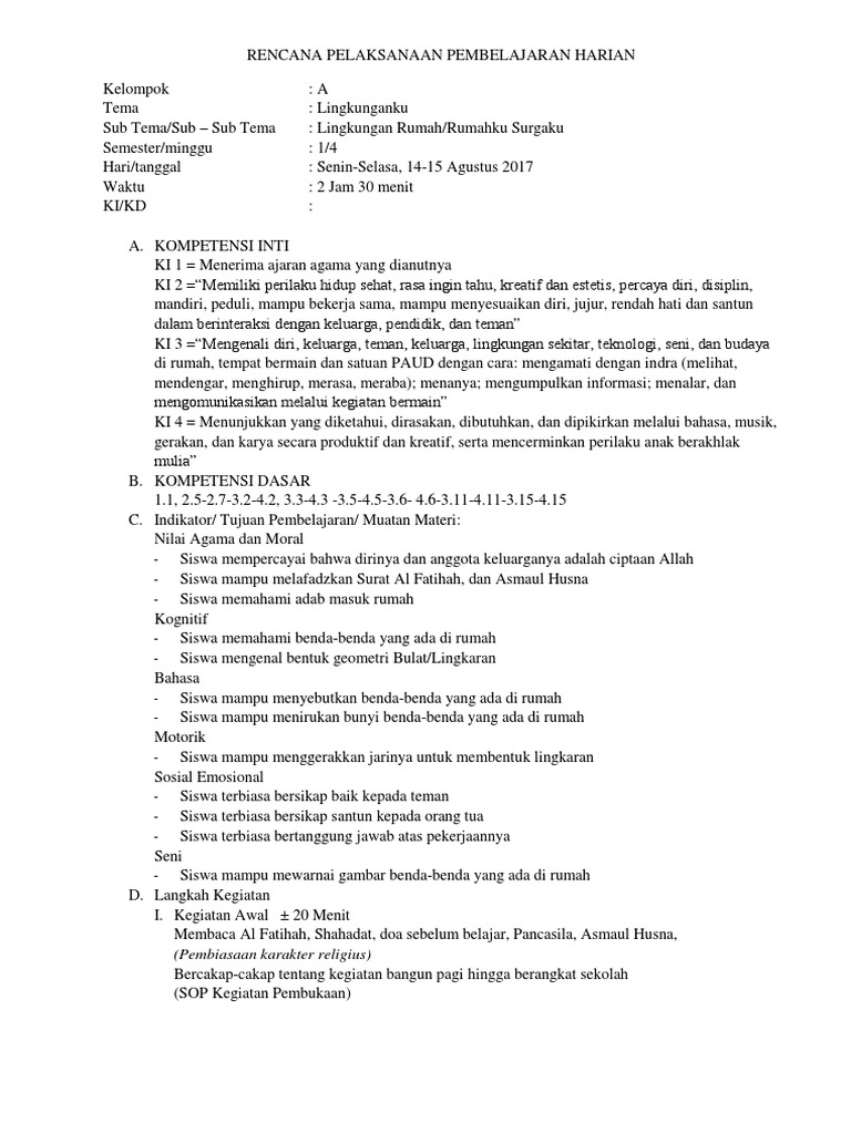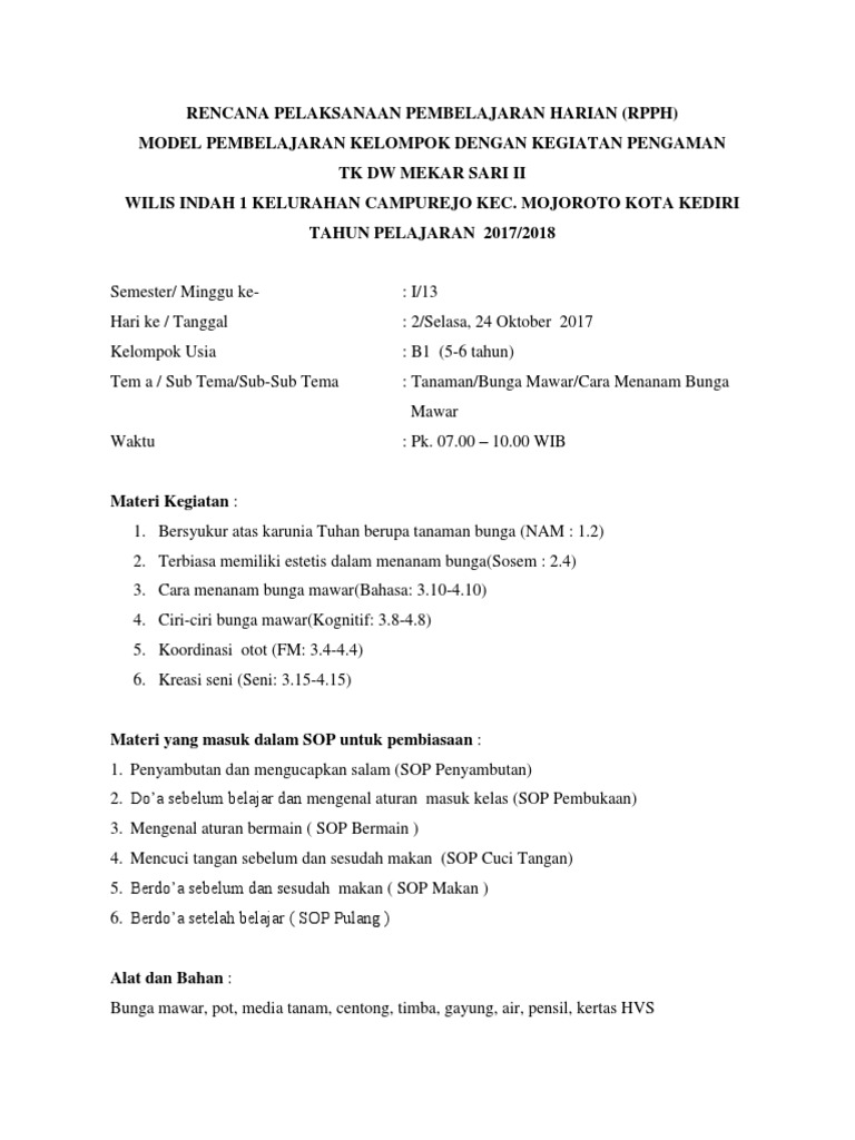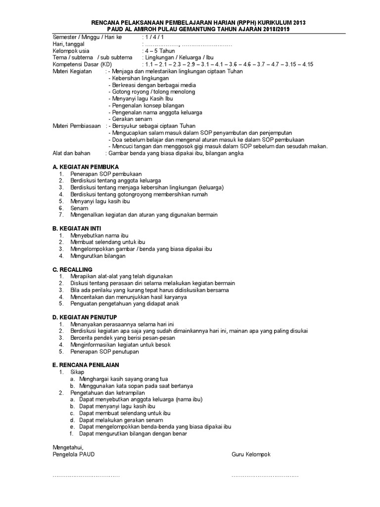 RPP ini dibuat berdasarkan pengembangan silabus disesuaikan pula dengan kegiatan pembelajaran peserta didik usia dini. Analisis kurikulum pengembangan perangkat pembelajaran paud. Rpph paud tema.