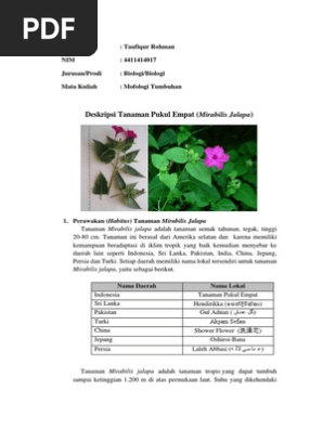 Selain itu pengamatan juga dilakukan dengan. Tanaman yang digunakan dalam penelitian ini adalah biji bunga pukul empat Mirabilis jalapa L. Menurut buku Gembong Tjitrosoepomo yang berjudul Taknsonomi Tumbuhan Spermatophyta bunga pukul empat termasuk golongan bunga tunggal terletak di ujung batang atau flos terminalis serta mempunyai daun pelindung yang saling menyatu.
